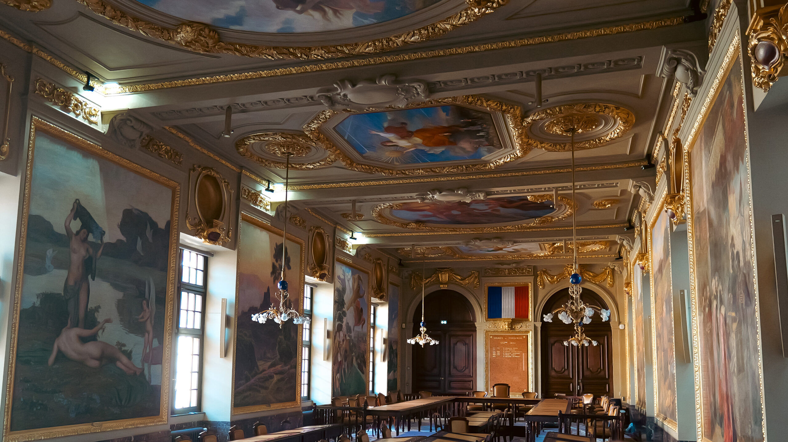 Elle abrite une collection impressionnante de peintures monumentales, réalisées entre le XIXᵉ et le début du XXᵉ siècle. Les murs et les plafonds sont couverts d’œuvres inspirées de l’histoire de Toulouse et de la région occitane.