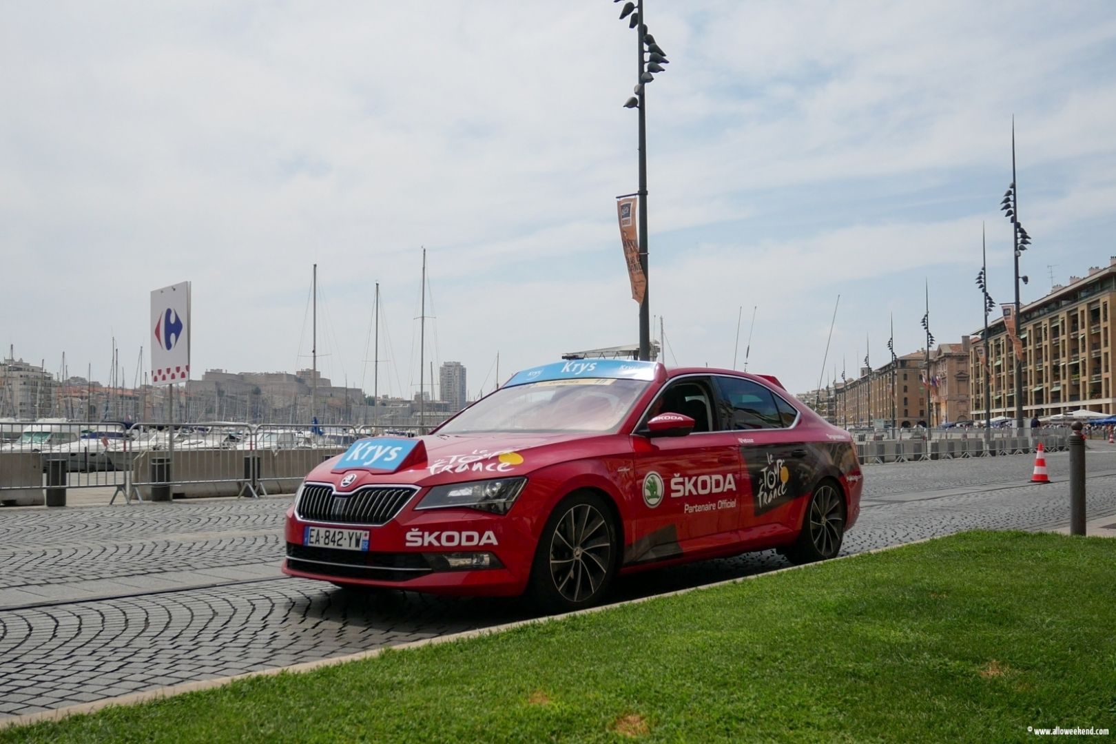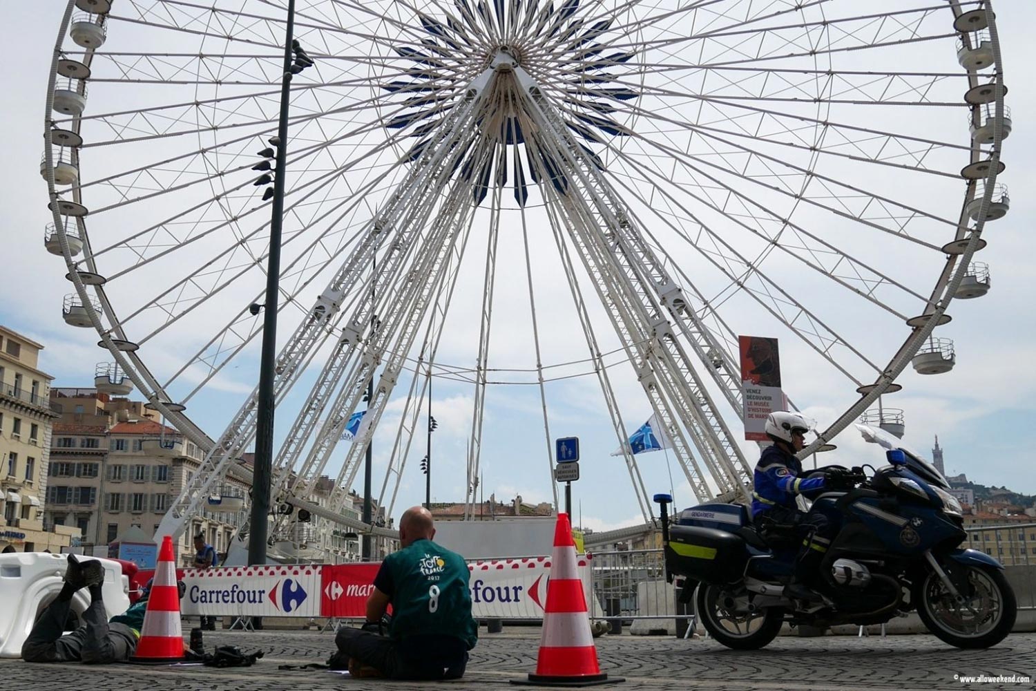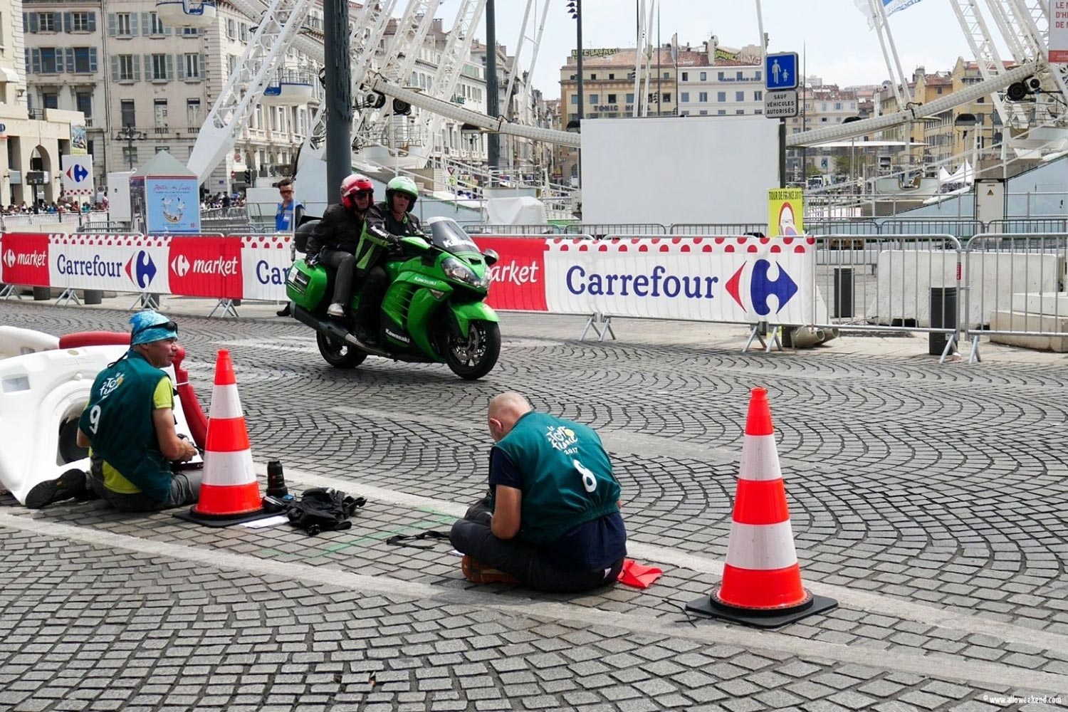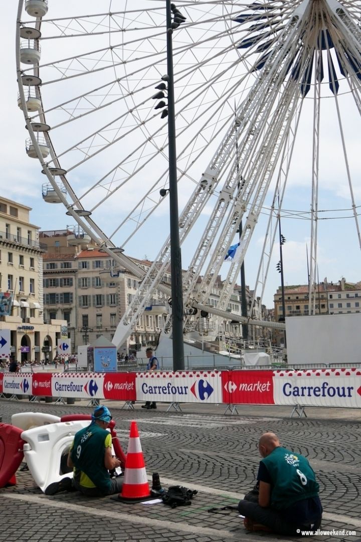 Photos Tour de France 2017 Marseille sur le Vieux Port. Reportage photo réalisé le samedi 22 Juillet, au pied de la grande roue, en face de l’ombrière. Marseille accueille à nouveau cet événement clef des étés français. Cela faisait un peu de temps que cela n’était fait, même si Le Tour de France sillonne la territoire nationale depuis 1903. Cela en fait des années et des générations ! C’est populaire et festif, l’esprit est encore présent dans la caravane et tout son environnement.